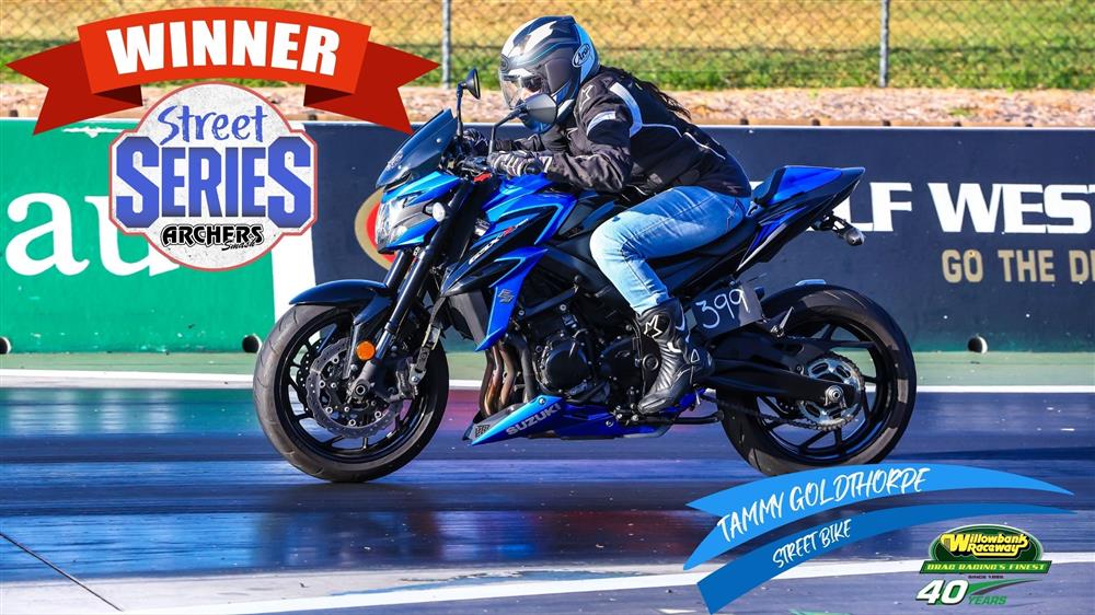 Heavy hitter and one of Willowbank Raceway’s winningest competitors, Tammy Goldthorpe, launched her comeback campaign in style with a strong win over Jason Clarkin in Street Bike.